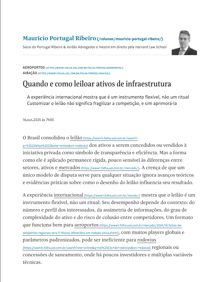 Mauricio Portugal Ribeiro, sócio fundador do Portugal Ribeiro & Jordão Advogados, é uma das principais referências do Brasil em matéria de estruturação, regulação e equilíbrio econômico-financeiro de contratos de concessões e Parcerias Público-Privadas (PPPs).